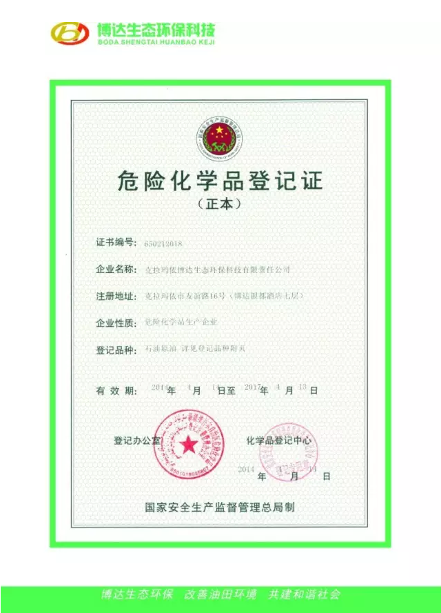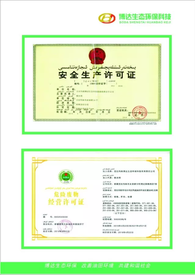 公司現(xiàn)持有自治區(qū)安全生產(chǎn)監(jiān)督管理局頒發(fā)的《安全生產(chǎn)許可證》;自治區(qū)環(huán)保廳頒發(fā)的《危險廢物經(jīng)營許可證》;自治區(qū)安科院頒發(fā)的《危險化學品登記證》;克拉瑪依市運管局頒發(fā)的《道路運輸經(jīng)營許可證》。